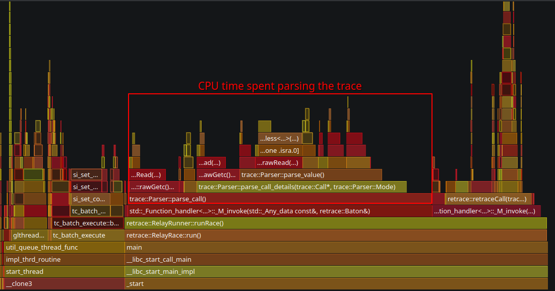 This looks fine, but I have no idea how fast the application is supposed to run. Running the same trace with perf reveals that there is room for improvement.